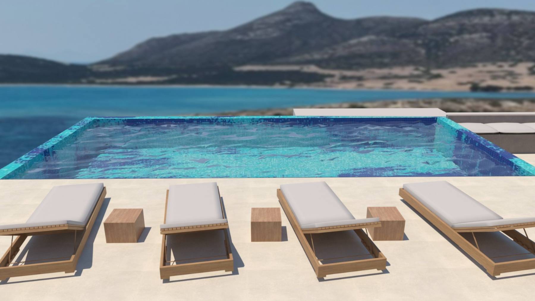 La estructura se articula en niveles que aprovechan la pendiente del terreno, garantizando privacidad y vistas panorámicas desde cada rincón. Materiales nobles como la piedra local, la madera natural y el estuco blanco evocan la estética tradicional de las Cícladas, mientras que el diseño contemporáneo aporta elegancia y funcionalidad. La zona chill-out integrada junto a la piscina invita al relax, ofreciendo un ambiente de serenidad total frente al mar.