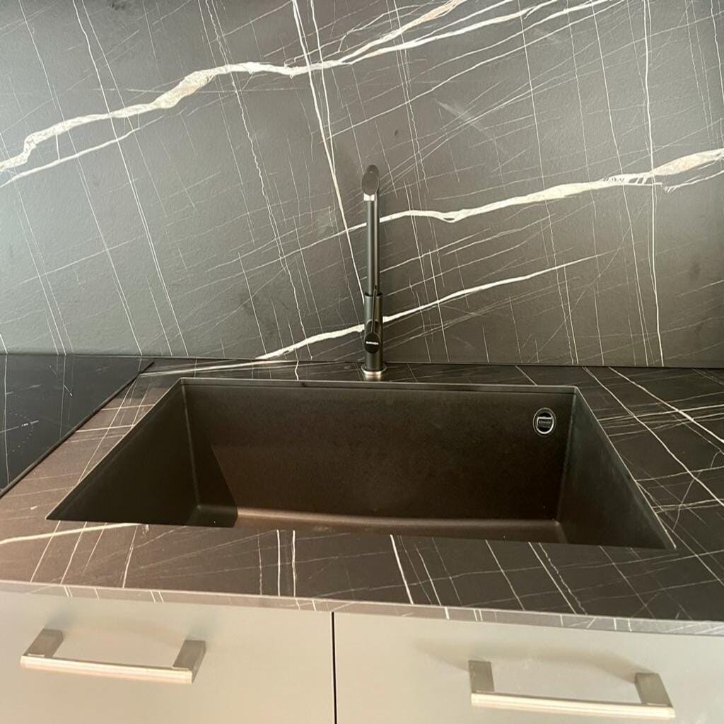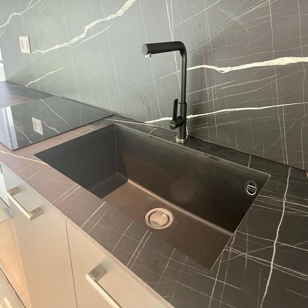 La cocina, concebida como una prolongación visual del diseño interior, combina la funcionalidad con una presencia escultural. Los tonos oscuros del mobiliario, en contraste con las vetas claras del revestimiento, refuerzan la identidad gráfica del espacio. Los baños, revestidos en grandes placas de mármol, revelan una atención exquisita por los detalles, con elementos suspendidos y líneas minimalistas que refuerzan la sensación de limpieza y amplitud.